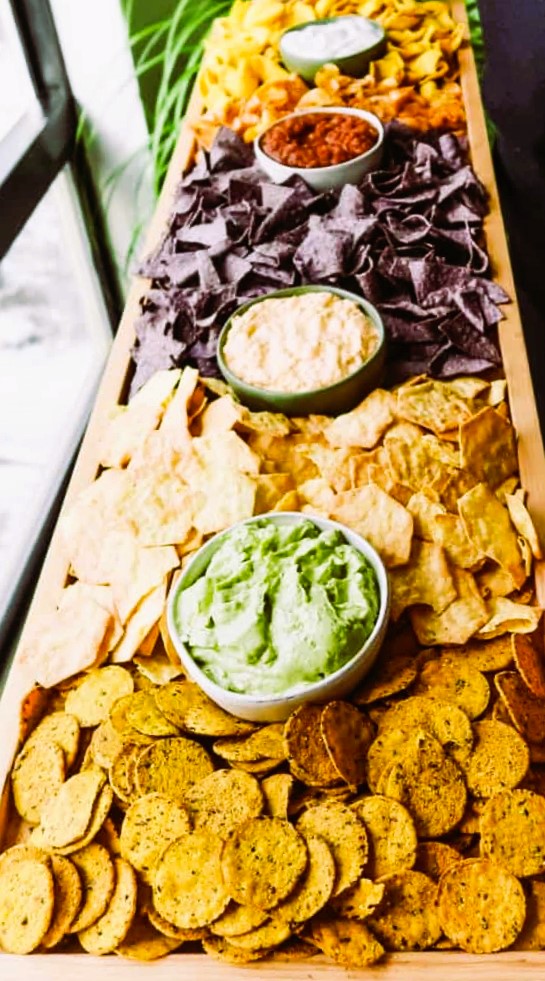 Fun idea: Line a long board with favorite chips and crackers and place these several different flavors of dip in small bowls in the midst of the chips/crackers. Cut out slices of cheese with number cookie cutters in "2024" and place on the board.)