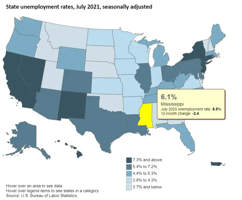 The current unemployment rate for Mississippi (as of May 2021) stands at 6.1 percent.