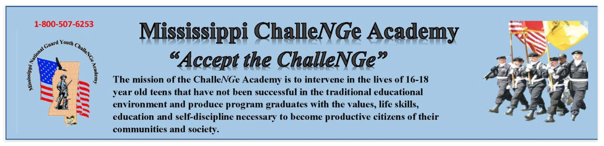 Youth ChalleNGe, located at Camp Shelby Ms. is the premier alternative education program for 16 to 18 year old youth who are struggling in school, or no longer attending. The program has a focus on job training, social skills and self-discipline.