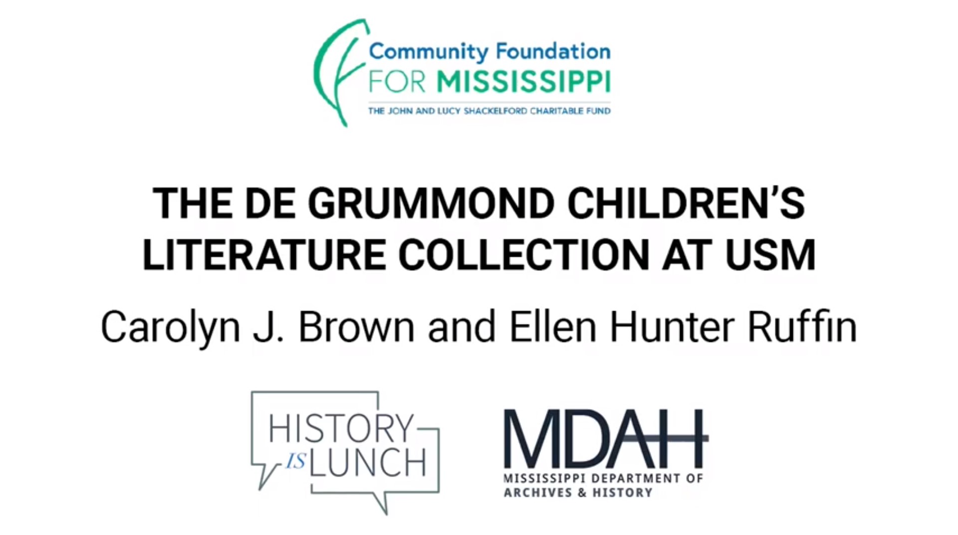 On August 18, 2021, Carolyn J. Brown and Ellen Hunter Ruffin presented “The de Grummond Children’s Literature Collection at USM” as part of the History Is Lunch series.