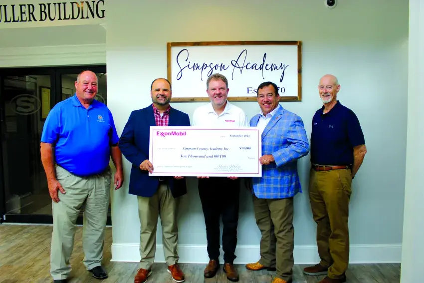 ExxonMobil Public Engagement Lead Mike Smith and Senior Client Representative Randy Haddad were accompanied by Rep. Price Wallace and Sen. Andy Berry as they presented a $10,000 grant check to Simpson Academy.