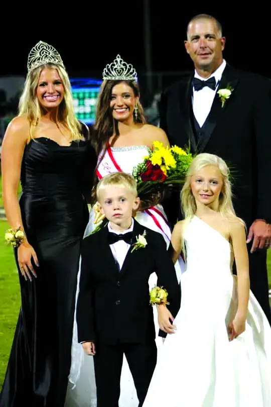 Molli Kate Garner, center back, was named the 2024-2025 Simpson Academy Homecoming Queen. Mollie Kate was crowned by previous queen Payton Purvis, back left. With them are, from left, front, Crown Bearer Barrett Franklin, Flower Girl Ann Vivian Welch, and back, right, Lance Garner.