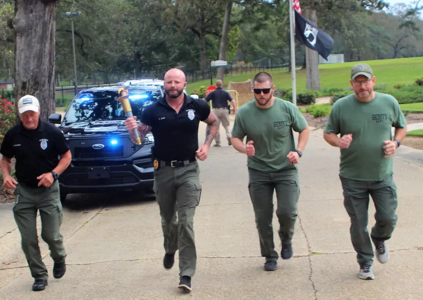 Running with the Special Olympics torch into Boswell’s campus recently as part of the Law Enforcement Torch Run are from left: Magee Police Officer Mike Grubbs, Magee Police Chief Chris Jones, Simpson County Deputy Mark Herrin and Simpson County Sheriff Paul Mullins. A ceremony honoring the athletes and officers was held on Boswell’s campus before the torch moved on to another location enroute to the Fall Games at Camp Shelby in Hattiesburg.
