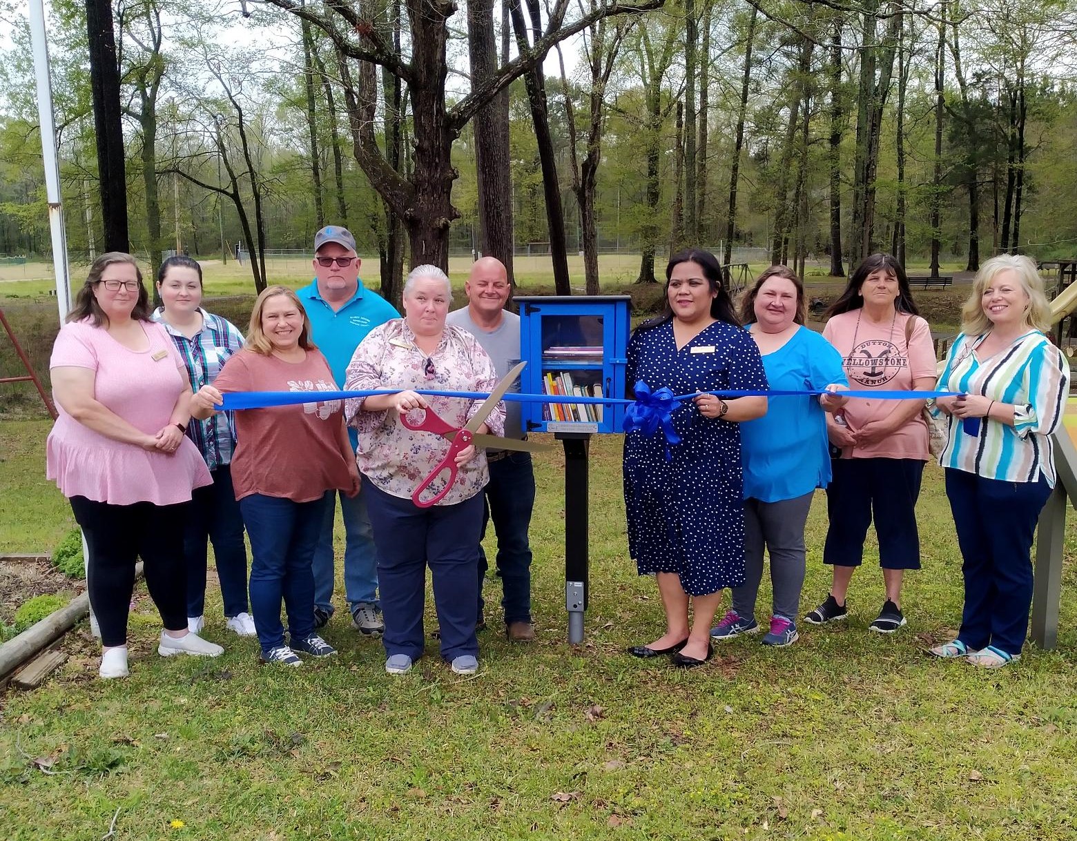 Attending the ribbon cutting for the Little Free Library in Harrisville are, from left, Frances Meadows, Magee Library Branch Manager; Julie Chencharick; Jill Zattoni, Friends of the Library member; Randy Moore, District 5 supervisor and HEC member; Kathie Jo Ward, Harrisville Library Branch Manager and husband John Ward; Mara Polk, CMRLS Director; Melanie Chain; Linda Sandifer; and Kathy Erwin, FOL member. Attending but not pictured is Carrie Brown CMRLS Coordinator of Programming.