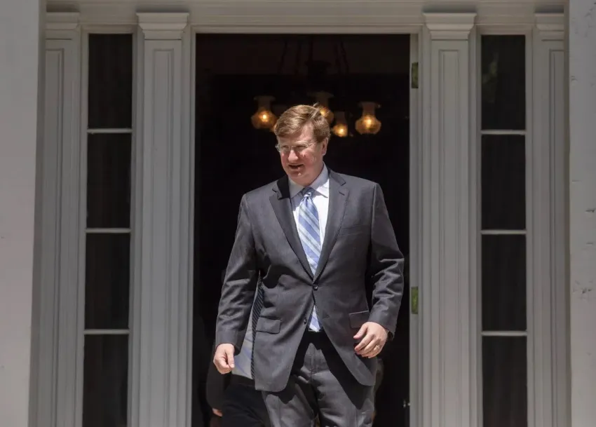 Gov. Tate Reeves walks out of the Governor's Mansion in Jackson, Miss., Thursday, March 26, 2020, as he prepares to speak to media about the coronavirus during a press conference. Credit: Eric J. Shelton/Mississippi Today, Report For America