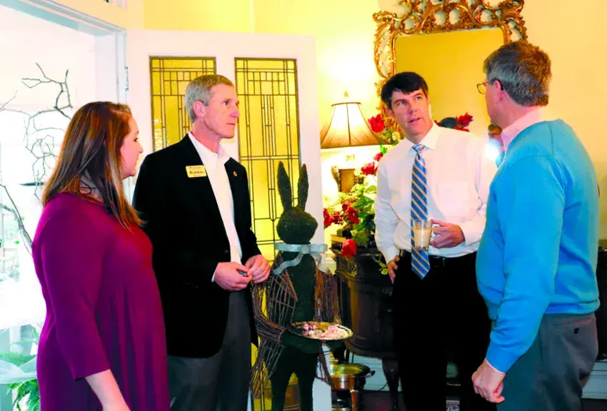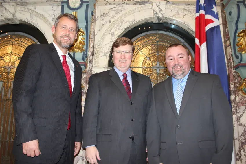 Brother Lance Varner, right, pastor of Calvary Baptist Church in Braxton, delivered an opening prayer to the Senate on Thursday, February 1, at the invitation of Senator Chris Caughman, left, who led the Pledge of Allegiance before Lt. Governor Tate Reeves, cetner, called lawmakers to order.