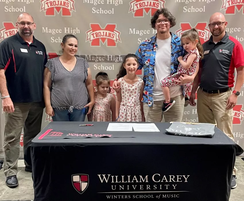Magee High has recognized and congratulated Brandon Mendez, second from right, for signing to continue band at William Carey. With Brandon are his mother, Veronica Padilla Forester, and sisters, Ava, Kayleigh, and Eden Forester. From William Carey are Dr. Jeremy Morgan and Jimi Brown.