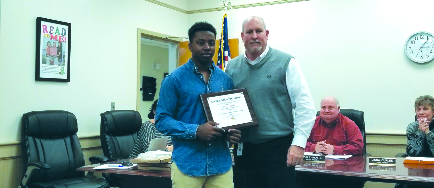 The district presented a certificate of recognition to Christian Allen of Mendenhall High School for his successful season as quarterback for the Tigers and for being selected Mr. Football there.