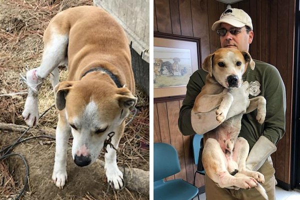 Cisco’s body and left rear foot had become entangled in the thin cord with which he was tethered. In Defense of Animals’ Doll Stanley documented Cisco’s tethered hell, his poor physical condition, and the delicate tether removal operation.