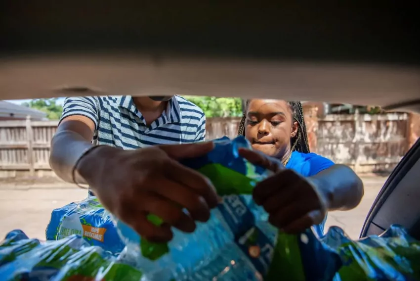 Marquise Hunt (left) and Maisie Brown deliver water to a Jackson, Mississippi resident on September 1, 2022. Credit: Rory Doyle/Deep Indigo Collective for Mississippi Today