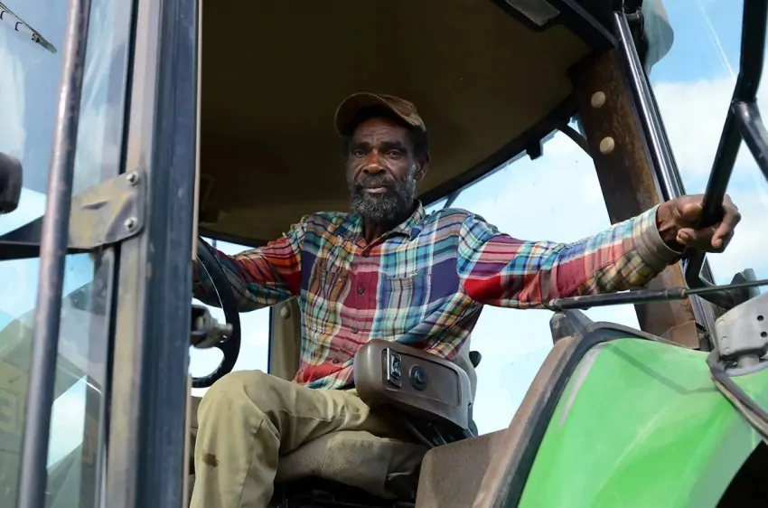 U.S.Secretary of Labor Marty Walsh (6th from left) and U.S. Rep. Bennie Thompson (second right) with Black farmers in the Delta involved in the Pitts Farm lawsuit, during a meeting at the Mississippi Center for Justice in Indianola, Thursday, June 30, 2022. Credit: Vickie D. King/Mississippi Today
