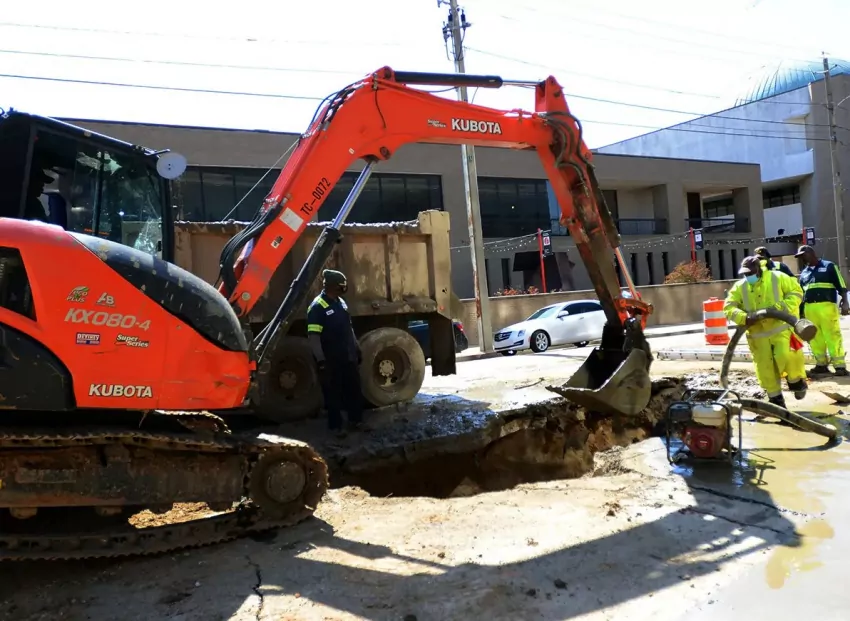 A city of Jackson Water Maintenance crew works to repair a broken waterline Match 6, 2021, on Pascagoula Street. Crews continue to repair the waterlines across the city in order to restore water to homes after severe winter storms crippled the city and state. Credit: Vickie D. King/Mississippi Today