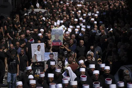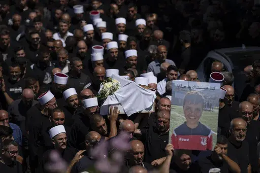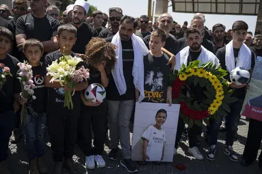 The body of 11-year-old Guevara Ibrahim was carried through the streets of the Druze town of Majdal Shams in the Israeli-controlled Golan Heights in a procession of people clad in black. Pictures of the smiling boy were hoisted up as his body, shrouded in white, was moved through the streets.