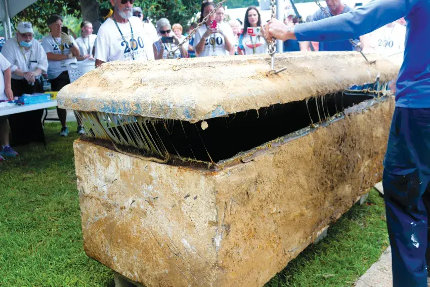 After the top of the vault was detached, Steen announced that while no water had seeped in, there was much black mold on several items. The volunteers wore masks and gloves while they carefully removed objects, placing them in baskets to begin the process of identification. Several on hand received personal items that family members had placed in the vault some recognizable and legible, others not.