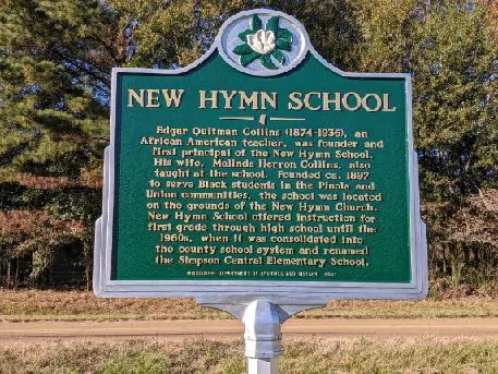 According to the Mississippi Department of Archives and History, New Hymn School was an African American school located in the Union community of Simpson County. It was founded around 1897 on the grounds of New Hymn Church by Edgar Quitman Collins, who also served as a teacher and the school’s first principal. Edgar Collins' wife, Malinda Herron Collins, also taught at the school.