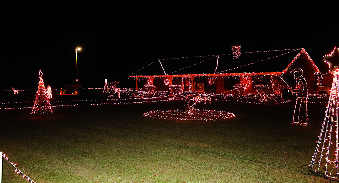 Decorating outside the house initially began in 1989 when Maddox purchased lights to put in some newly planted bushes along the driveway. “It grew from there. Each two or three years you’d say ‘I’m going to do this.’ Now I guess, the full yard, I’ve been doing about 20 years or so.” Maddox estimates he has between 45,000 and 50,000 lights, which adds about $300 to his power bill for the month of December. He runs them from sundown to 9:30 p.m. each day. This year the yard will be lit from December 5 to Christmas Day. He begins dismantling the display on December 26.