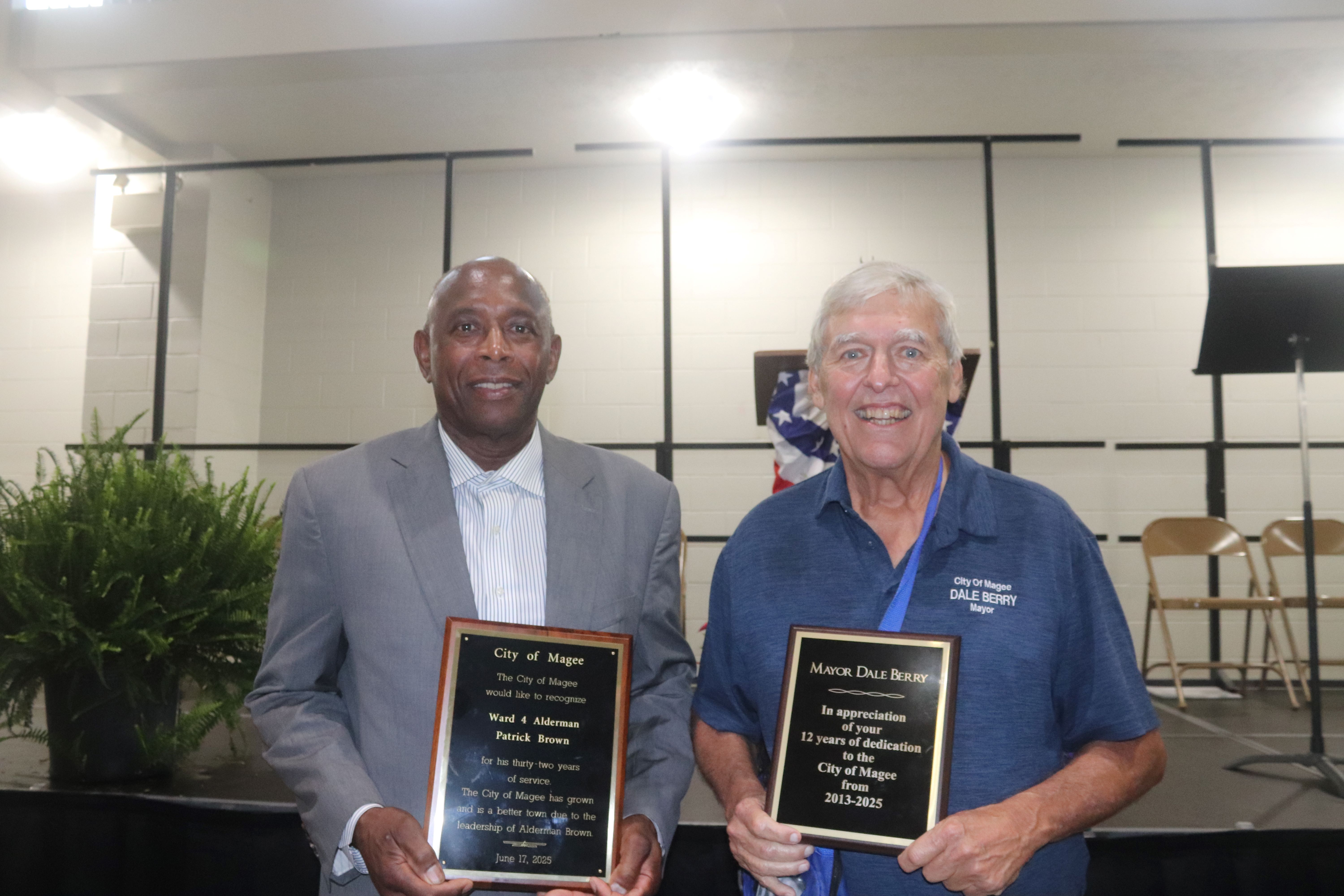 Mayor Dale Berry and Alderman Patrick Brown were honored at a retirement reception Monday, June 16 at the First Baptist Church of Magee family Life Center.