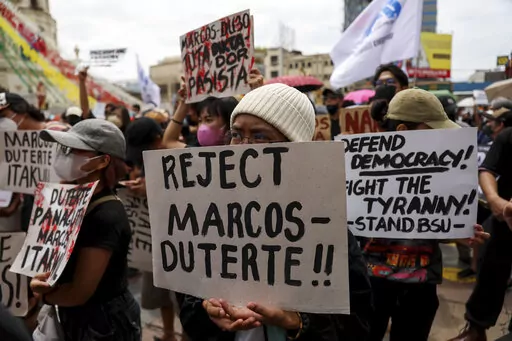 Marching in the streets, the protesters displayed placards that read, ”Never again to martial law” and “Reject Marcos-Duterte.”