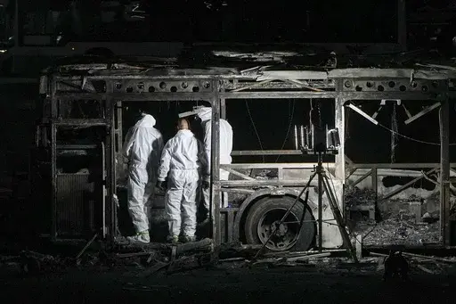 Investigators in white coveralls searched for evidence inside the burned-out metal shells of the buses, which blew up in a parking lot in Bat Yam, a city outside Tel Aviv.