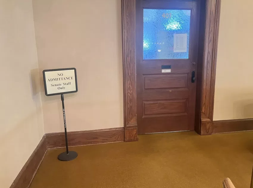 The committee hearing occurred on April 23 at 1 p.m. in room 407, a small room tucked away in a corner of the fourth floor observation balcony, behind a scanner, a security guard, an assistant’s desk and a sign that says “NO ADMITTANCE Senate Staff Only.” (John Sewell, IHL’s spokesperson, said he did not recall the sign being outside the door that day.)