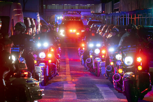 A solemn scene unfolded Sunday with a column of uniformed police officers, as well as a line of firefighters, flanking the streets as a hearse carrying the fallen officer left the medical examiner’s office.