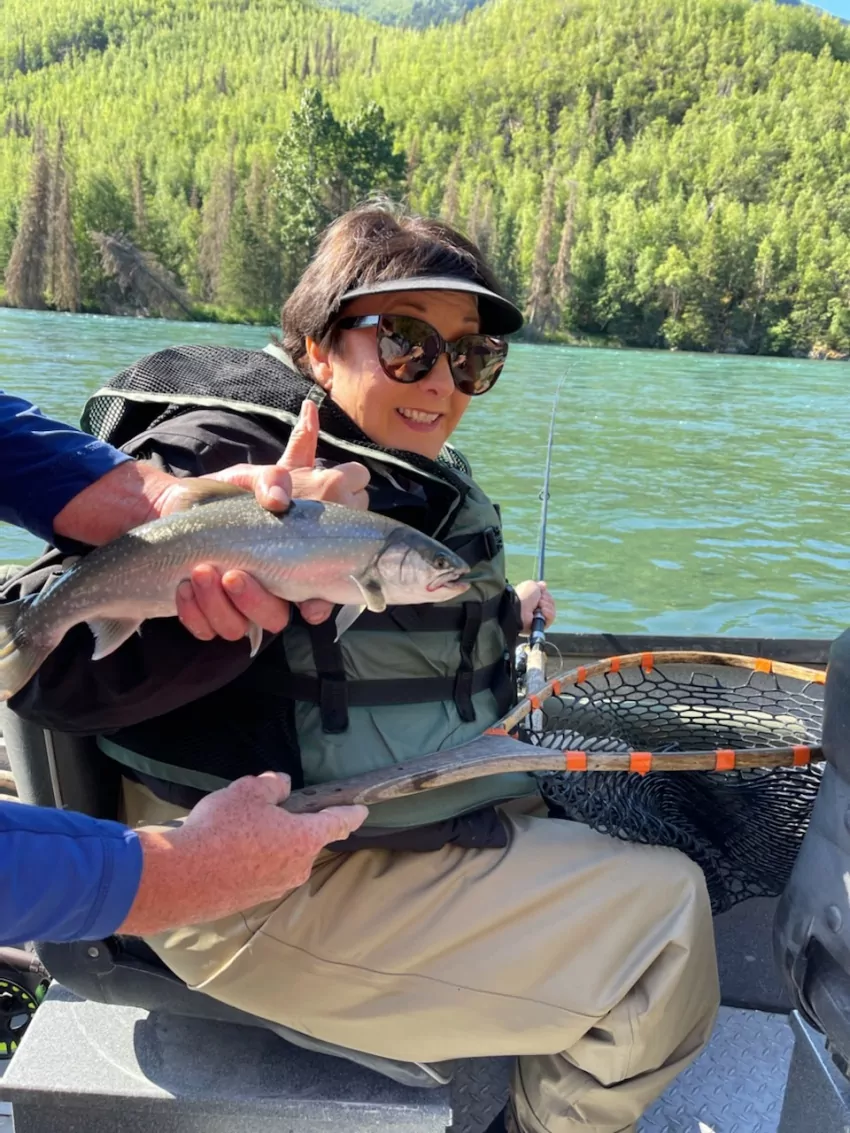 Nancy was the first to hook one while fishing on a spinning rig. It was a nice Dolly Varden, which is one of the many species of trout found along the river.