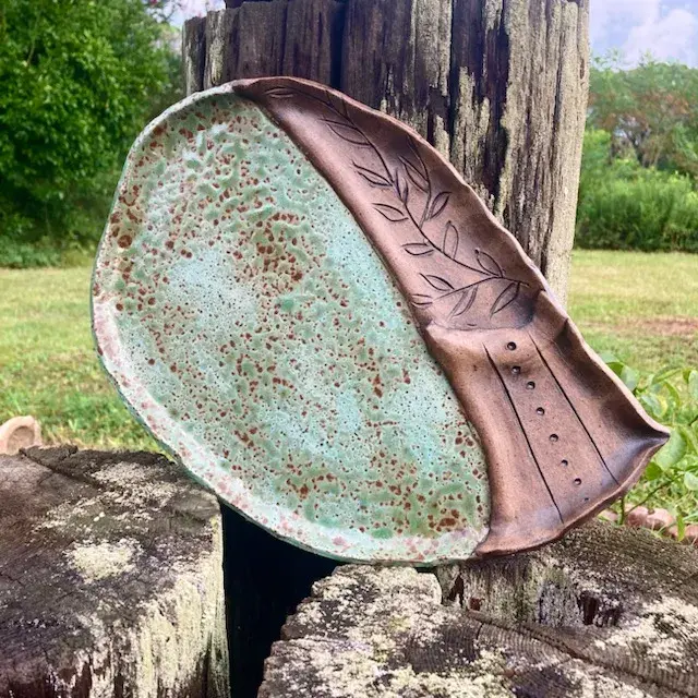 “I had to figure out the correct combination of percentages for melting material and things like that in order to make that ash melt at my temperature (mid-range). I spent a year burning, collecting, and sifting. You have to sift – it has to be the fine part of the ash. It’s a lot of work involved. It’s not simple; it’s time consuming,” Lane said. She now makes all her own glazes.