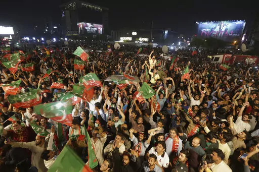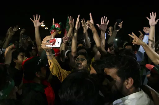 In the southern Arabian Sea port city of Karachi more than 20,000 shouted slogans promising Khan's return to power. In the capital of Islamabad, the lights from thousands of supporters lit up the night sky as Khan made his way through the crowd atop a brightly colored truck.