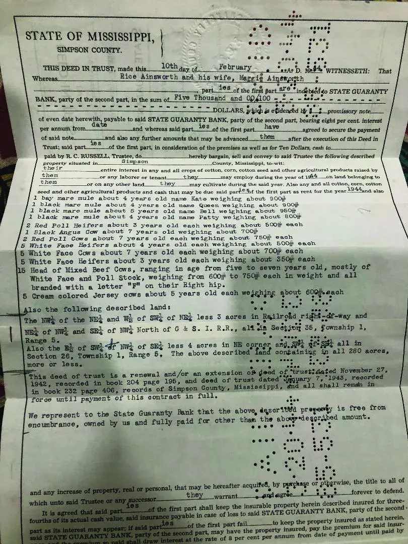 It was here that Wiley began using his cows and mules, actually naming them on the loan application, as collateral for buying more land. “In about two to two and a half years he would pay that note off. Then he would do another note for another piece of property. That’s how he bought his property.”
