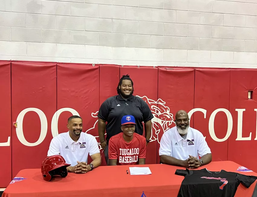 Magee High has recognized and congratulated Brandon Mendez, second from right, for signing to continue band at William Carey. With Brandon are his mother, Veronica Padilla Forester, and sisters, Ava, Kayleigh, and Eden Forester. From William Carey are Dr. Jeremy Morgan and Jimi Brown.