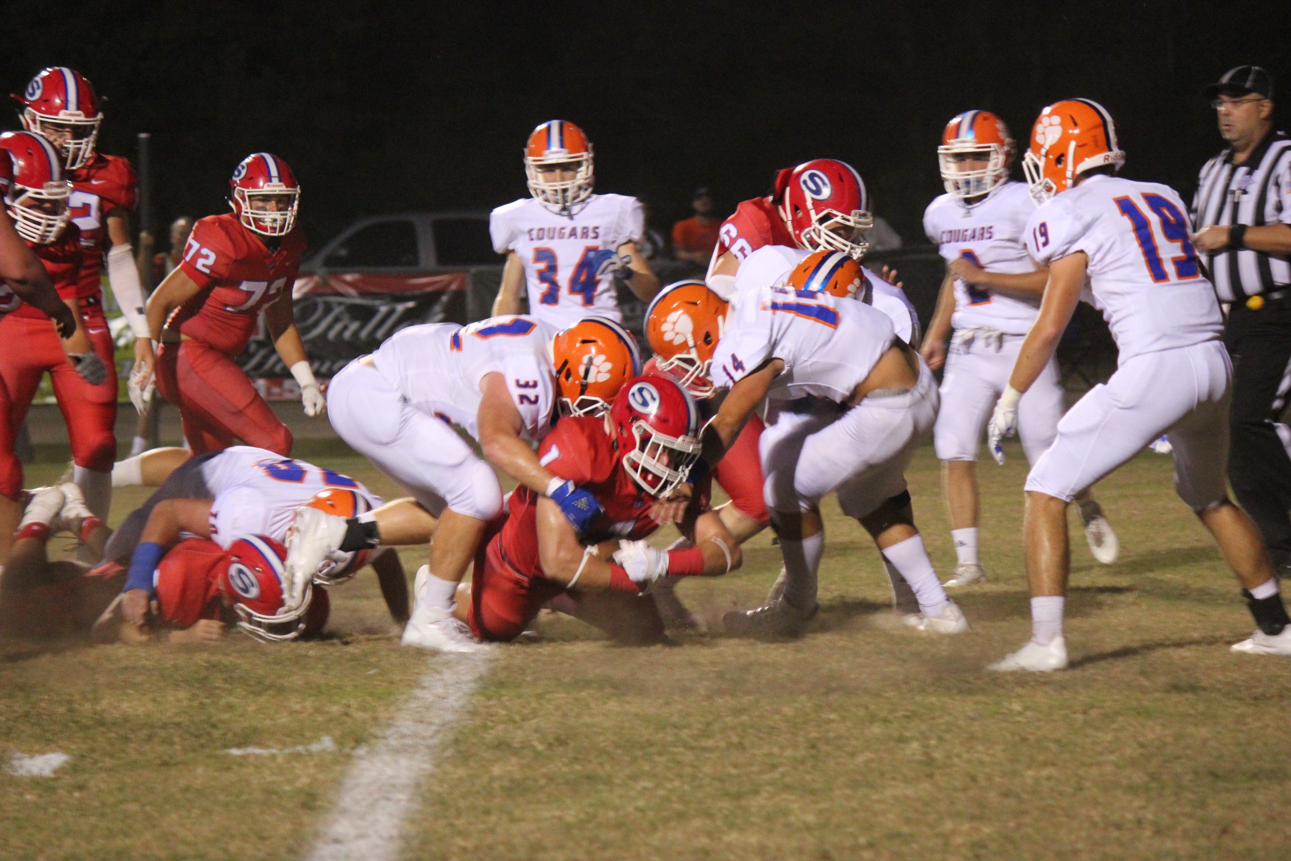 Leading the Cougars offensively in the rushing game were Cook Weathersby 18 carries for 139 yards and a touchdown, Dylan Hallman with 10 rushes for 104 yards and a 2 point conversion, and Ethan Flynt 9 carries for 42 yards and 2 touchdowns. In the passing game, Hunter Cline had 1 reception for 31 yards and a touchdown, and Ethan Flynt completed 2 passes for 34 yards and a touchdown. The Cougars were led defensively by Austin Creel in on 13 tackles, Caleb Garner in on 12 tackles, and Corbin Hosey in on 11 tackles. Caleb Garner, Austin Creel, and Daniel Pepper had 2 sacks or tackles for loss. Corbin Hosey and Cole Weeks had a tackle for loss for the Cougars. Simpson had one takeaway. Thomas Pepper recovered a fumble.