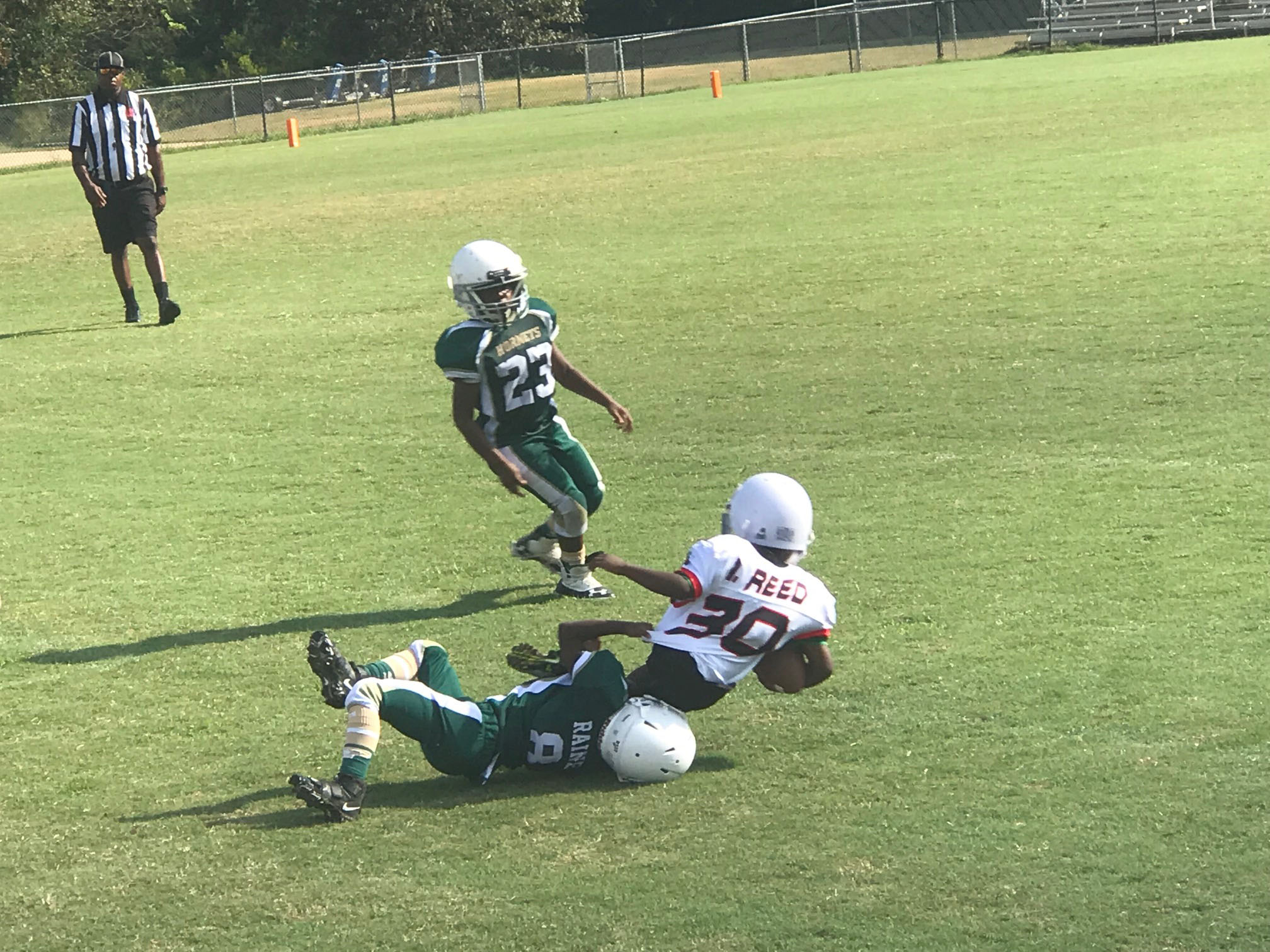 Tinamites (5-6 yrs) got things started off first. After the Hornets won the coin toss and deferred to the second half, the Falcons began on their own 20 yard line. First play from scrimmage Aiden Reed ran for 45 yards only to have it negated on a holding penalty. If it worked once why not try again, and thanks to a great block by fullback JaMorris Byrd, Reed broke free for a 60 yard touchdown run. Quarterback Atilla Powell added the PAT. Falcons led early 8-0.