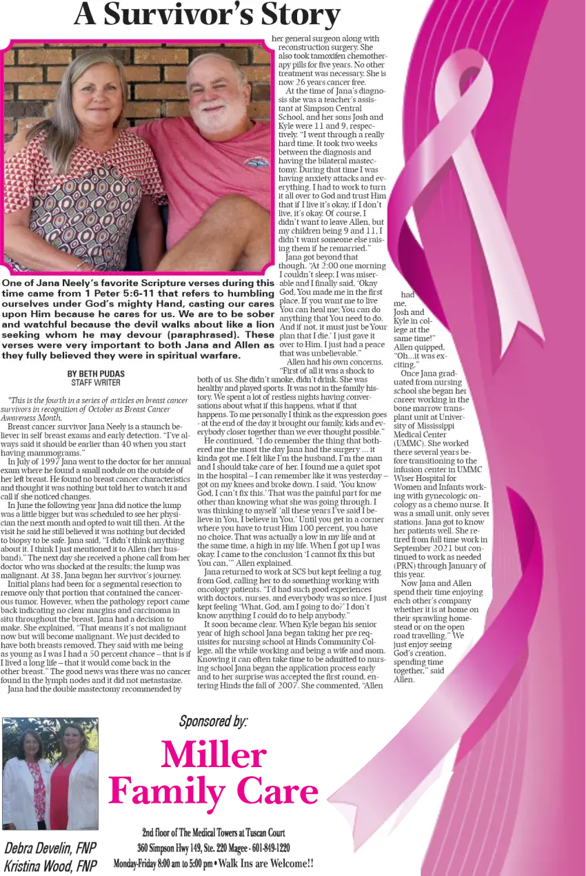 Breast cancer survivor Jana Neely is a staunch believer in self breast exams and early detection. “I’ve always said it should be earlier than 40 when you start having mammograms.”