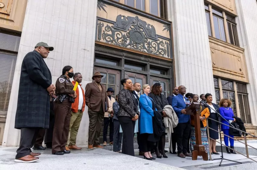 Circuit Court Judge Winston L. Kidd, center, stands with other Hinds County judicial officers as he speaks about their opposition of proposed House Bill 1020 at the Hinds County Circuit Courthouse in Jackson, Miss., Tuesday, January 31, 2023. Credit: Eric Shelton/Mississippi Today