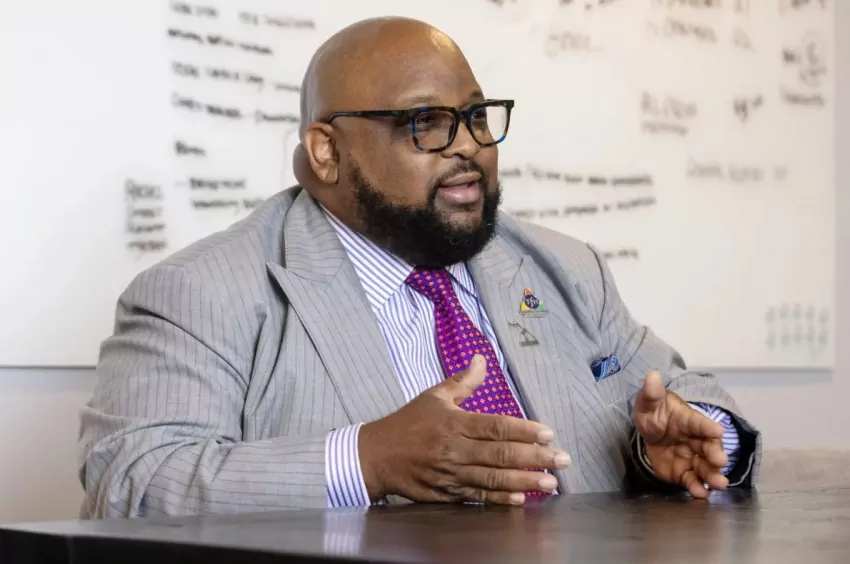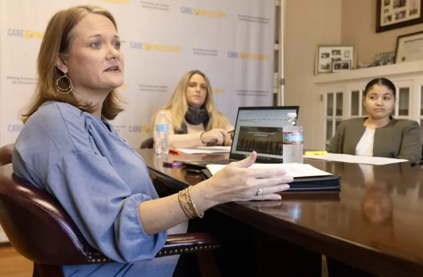 Care4Mississippi coalition members Kimberly Hughes, from left, Blair Ewing, and Khaylah Scott discuss the coalition and its mission on Thursday, Jan. 11, 2024, at the Mississippi Health Advocacy Program office in Jackson, Miss. Credit: Eric J. Shelton/Mississippi Today