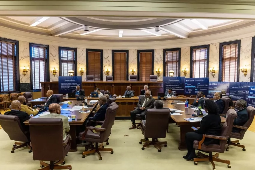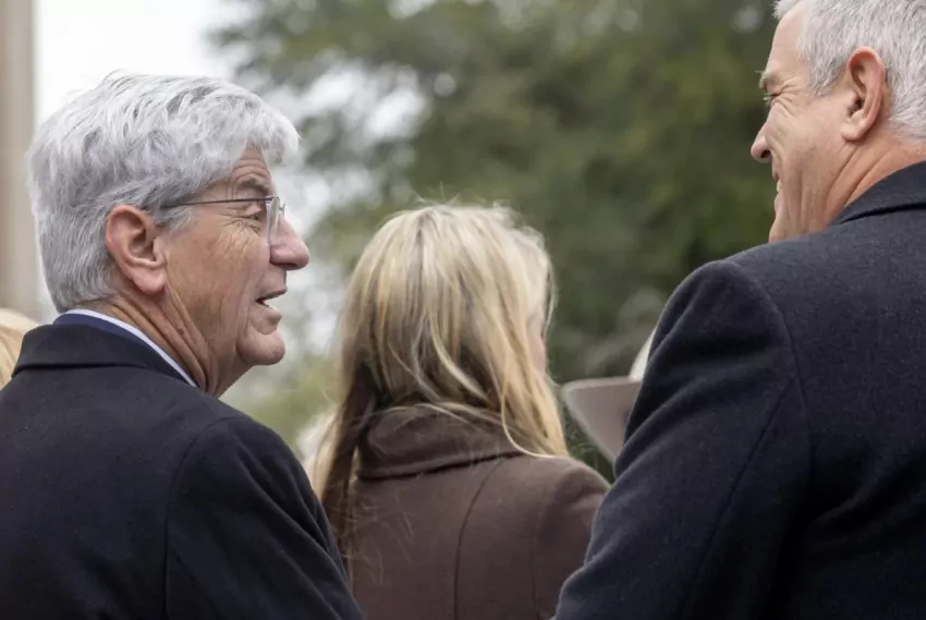Former Mississippi Gov. Phil Bryant, left, and former House Speaker Philip Gunn share a laugh before Gov. Tate Reeves' inauguration ceremony at the Mississippi Capitol in Jackson, Miss., Tuesday, Jan. 9, 2024. Credit: Eric J. Shelton/Mississippi Today