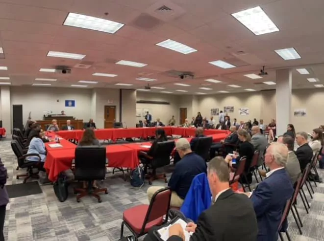 Ag Commissioner Andy Gipson, along with state and local law enforcement officials, addressed security staff and safety measures for the upcoming 2022 Mississippi State Fair. Pictured are officials representing the Mississippi State Fairgrounds, Mississippi Highway Patrol, Mississippi State Capitol Police, Department of Homeland Security, State Fire Marshal’s Office, Mississippi Department of Wildlife, Fisheries and Parks, Mississippi Agricultural and Livestock Theft Bureau, Hinds County Sheriff’s Office, and Jackson Police Department.