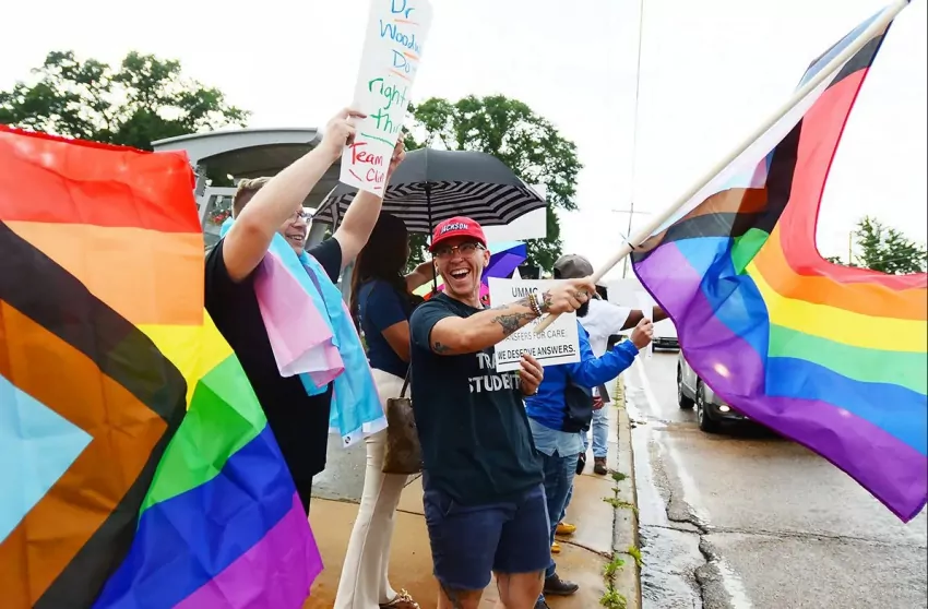 Jason McCarty, Capital City Pride Executive Director (center) and Eleven Cook, were among a group of demonstrators protesting the University of Mississippi Medical Center's decision to close TEAM Clinic that provided care for the LGBTQ+ community, Tuesday, June 6, 2023 in Jackson. Credit: Vickie D. King/Mississippi Today