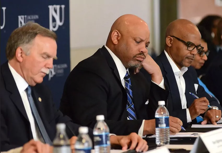 Dr. Alan Jones, associate vice chancellor for clinical affairs at UMMC, center, listens as Dr. LouAnn Woodward, vice chancellor for health affairs and dean of the School of Medicine, answers questions during a Health Affairs Committee meeting at the Universities Center in Ridgeland, Miss., Wednesday, January 18, 2023. Credit: Eric Shelton/Mississippi Today