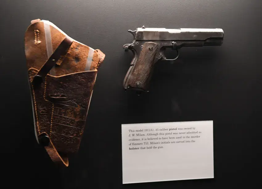 Clinton resident James Robinson shares with Rep. Zakiya Summers the tale of how his great, great, great grandmother Sally Lee (pictured) survived the Clinton Massacre in 1875, Thursday, Sept. 4, 2025, at the Mississippi Freedom Trail Marker commemorating the tragedy. The marker is located in the 300 block of Northside Drive in Clinton. Credit: Vickie D. King/Mississippi Today