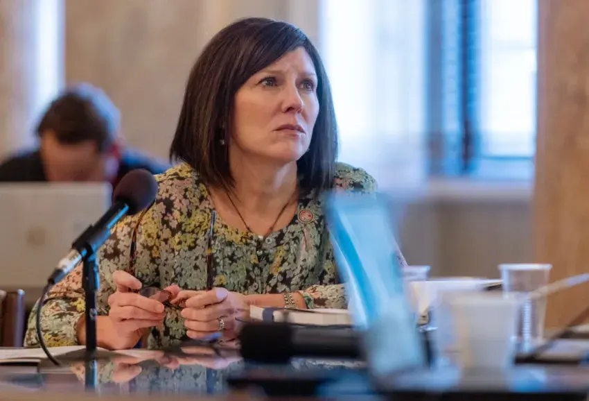 House Medicaid Committee Chairwoman Missy McGee, R-Hattiesburg, listens as representatives from The Hilltop Institute give a presentation during a Medicaid hearing at the State Capitol in Jackson, Miss., Tuesday, February 20, 2024. Credit: Eric J. Shelton/Mississippi Today
