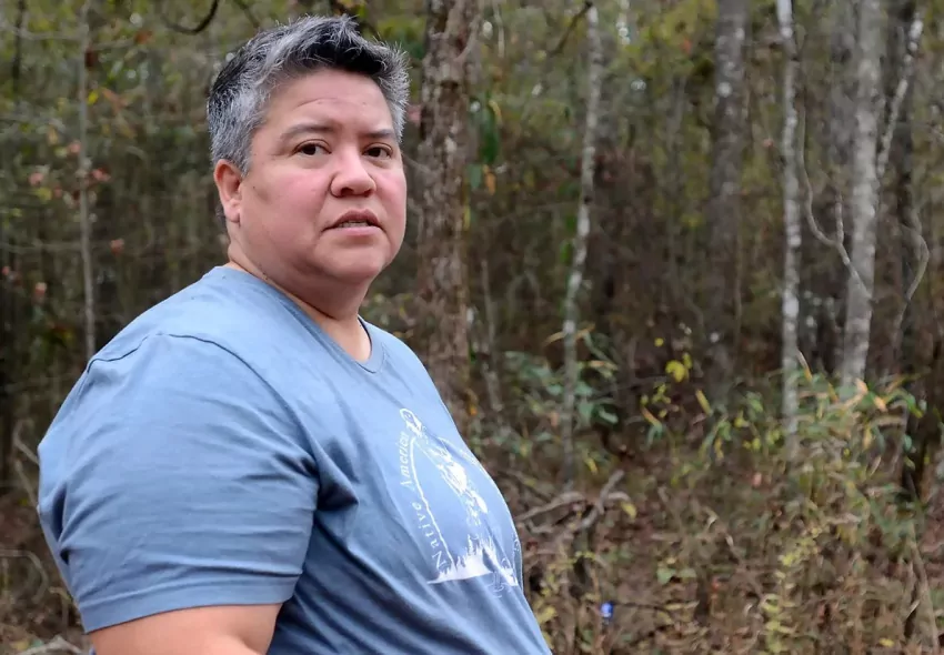 Mitzi Reed, invasive species coordinator for the Native American Fish and Wildlife Society, in one of her favorite places, a swamp area surrounding Beaver Creek Road, adjacent to the Pearl River on Choctaw land, Friday, Nov. 17, 2023. Reed is also a biologist, conservationist, and a member of the Mississippi Band of Choctaws, helping to preserve Choctaw culture and customs, and inspiring the youngsters to get outside. Credit: Vickie D. King/Mississippi Today