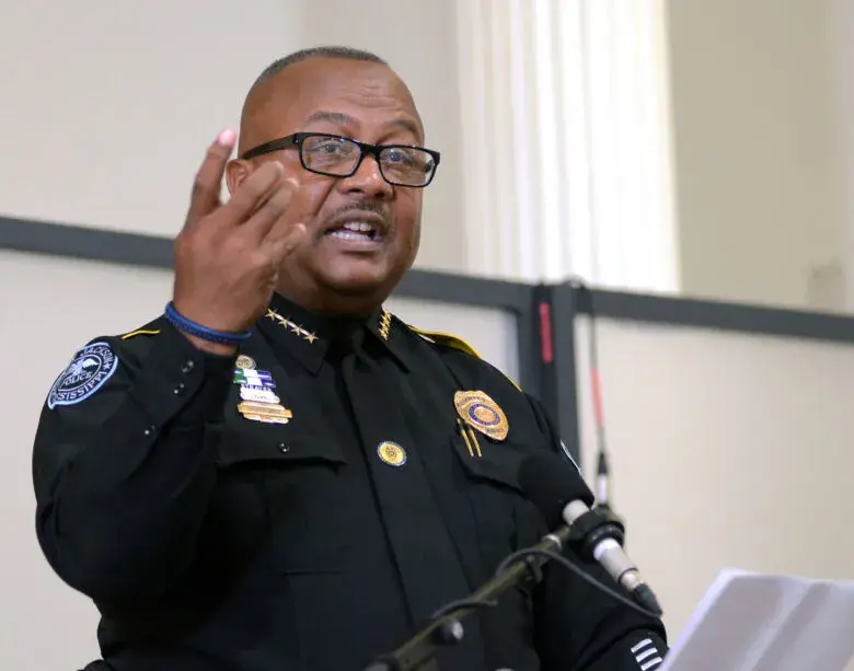 Jackson Police Chief Joe Wade, speaks with homeless individuals regarding recent legislation prohibiting squatting, encampments, and panhandling without a permit, at Stewpot, Thursday, July 3, 2025 in Jackson. Credit: Vickie D. King/Mississippi Today