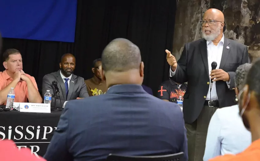 U.S. Rep. Bennie Thompson, speaks during testimony from Black farmers at a panel discussion held at the Mississippi Center for Justice in Indianola, Thursday, June 30, 2022. U.S. Sec. of Labor Marty Walsh (left) and Mississippi Center for Justice attorney Ty Pinkins, were among the attendees. Credit: Vickie D. King/Mississippi Today