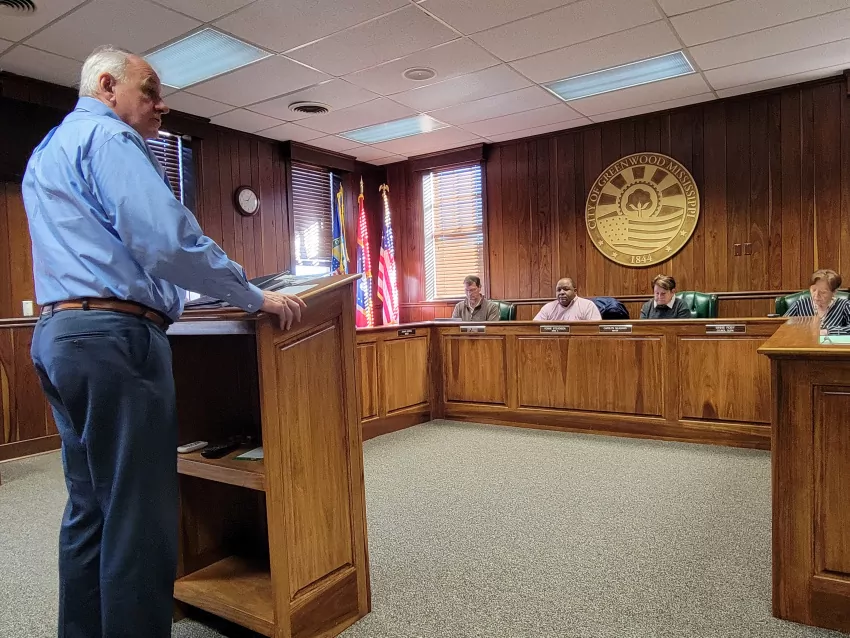 Gary Marchand, the interim CEO of Greenwood Leflore Hospital, explains to the Greenwood City Council Wednesday why the hospital needs the city’s financial help to complete the hospital’s lease to the University of Mississippi Medical Center. (By Kevin Edwards)