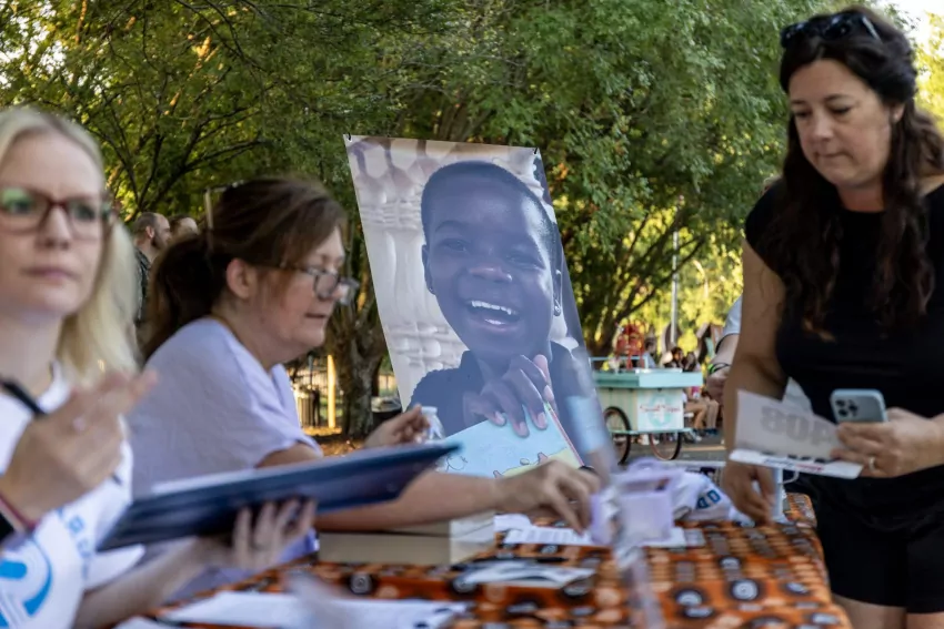 Candace Abdul-Tawwab, left, listens as Okolo Rashid gives her thoughts on the Israeli–Palestinian conflict during a pro-Palestine rally at the International Museum of Muslim Culture in Jackson, Miss., on Monday, Oct. 16, 2023. Credit: Eric J. Shelton/Mississippi Today