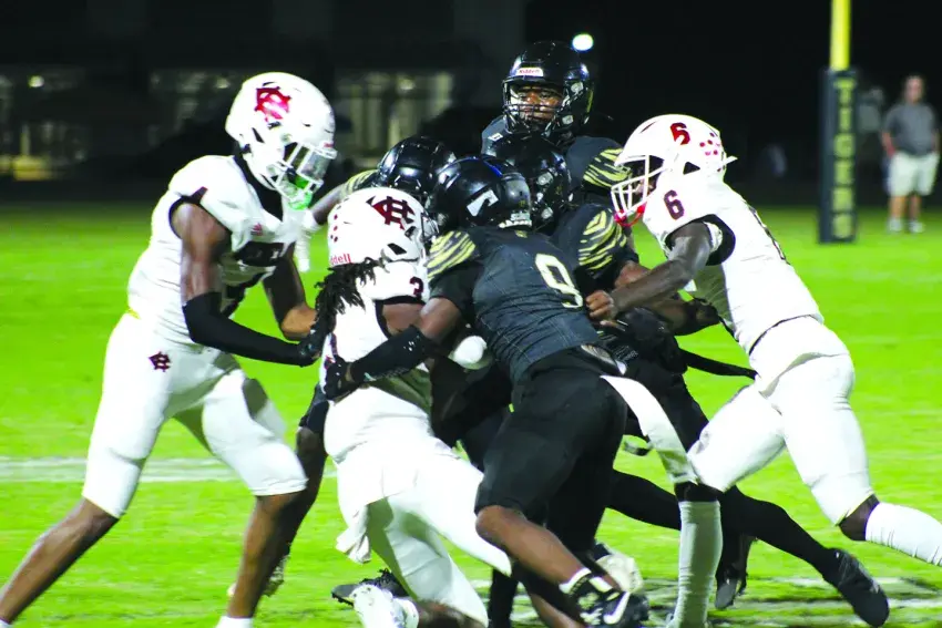 With time ebbing away in the fourth quarter, the Tigers desperately needed a stop. The defense answered the call in the crucial situation when Harrison Central needed a first down to put the game away. The Tiger defensive line was stout and gave little running room to the Rebels, whose quarterback was in the heavy duress at each snap, and the defense was able to hold Harrison Central, forcing a punt.