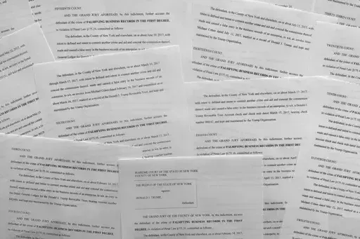 Prosecutors unsealed the indictment against the former president Tuesday, giving Trump, his lawyers and the world their first opportunity to see them. Trump was charged with 34 counts of falsifying business records in the first degree. Prosecutors said Trump conspired to undermine the 2016 presidential election by trying to suppress information that could harm his candidacy, and then concealing the true nature of the hush money payments. The payments were made to two women — including a porn actor — who claimed they had sexual encounters with him years earlier, and to a doorman at Trump Tower who claimed to have a story about a child Trump fathered out of wedlock, according to the Manhattan district attorney's office.