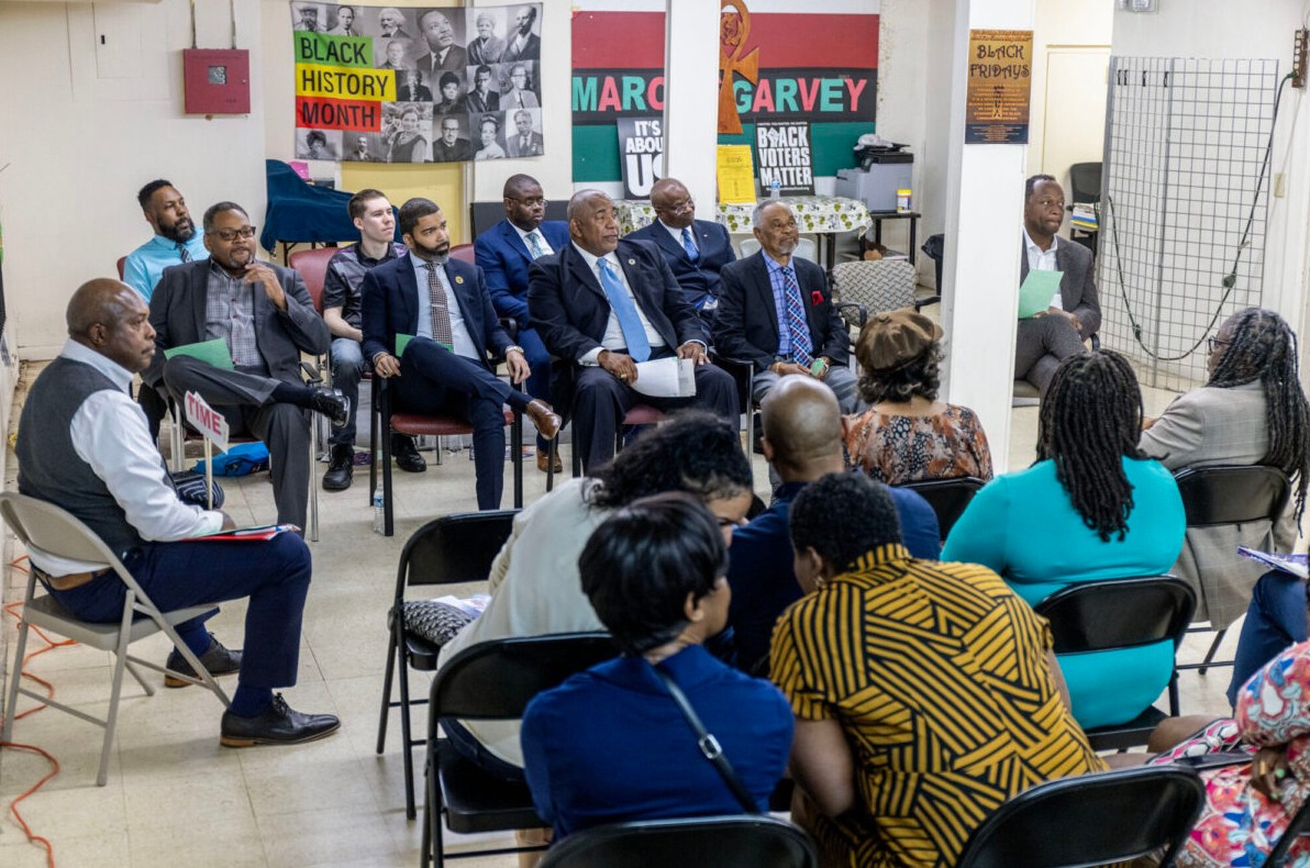 Mayoral candidates listen during a political forum at the Afrikan Art Gallery in Jackson, Miss., on Monday, March 17, 2025. Credit: Eric Shelton/Mississippi Today