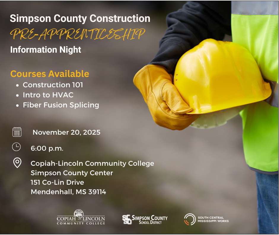 To introduce the program, an Information Session will be held on Thursday, November 20, 2025, at 6:00 PM in the Multipurpose Room of the Copiah-Lincoln Community College Simpson County Center in Mendenhall, MS.